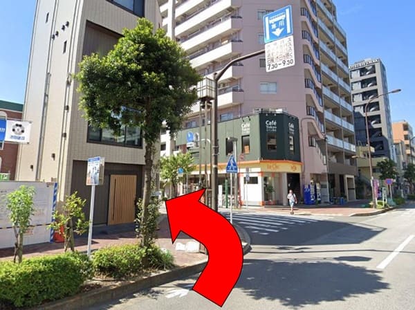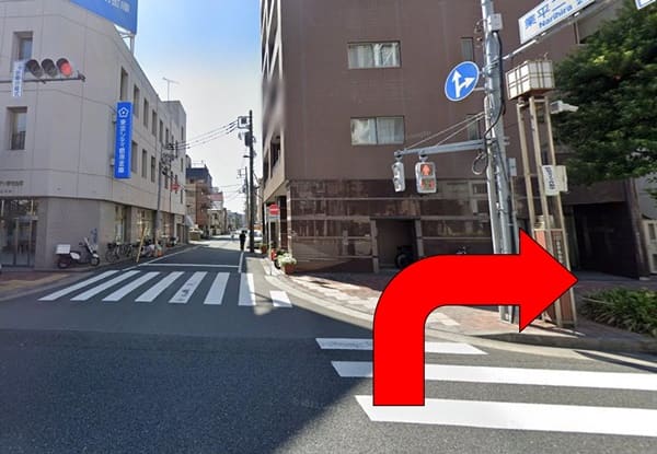 歩道橋のすぐ先にある横断歩道を渡り、今度は左を向いて再び横断歩道を渡りましょう。