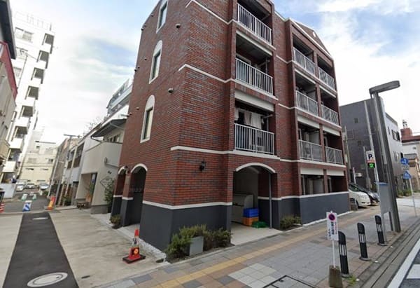 少し歩くとこちらのレンガ調のマンションが左側に見えてきます。