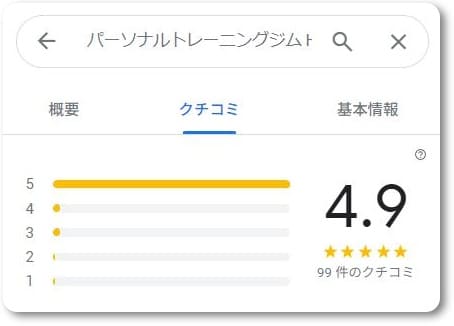 上の画像はGoogleマップでの口コミ点数の内訳ですが、低評価の口コミがほぼないのがわかると思います。
