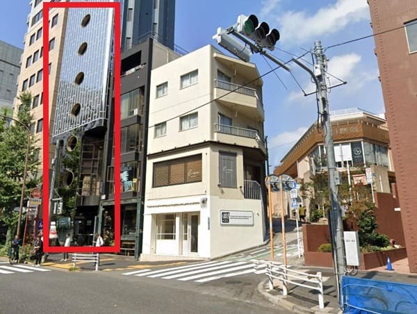 横断歩道の先にあるガラス張りのビルが、ハビット恵比寿店が入ったビルです。