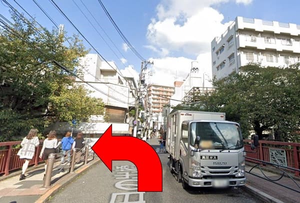 100mほど歩き、日の出橋を渡ったら左に曲がりましょう。