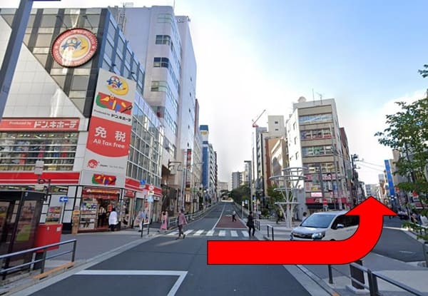 ドン・キホーテの前の横断歩道を渡り、左に曲がって繁華街に入りましょう。